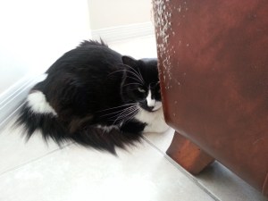 Slash lived primarily either under the bed or in the basement (which was finished, complete with furniture, but without a constant, intrusive human presence).  Feral mom taught us to steer clear of humans, and he was a particuarly erudite student.  I’ll never forget when Oscar found him hiding in the bathroom.  We had apparently startled him by coming in the office unexpectedly, and this was his only place to escape.  Oscar followed him, and he peered at him cowering behind the toilet.  Oscar gave him an encouraging sniff, and it was clear that this did make Slash feel a bit better.  As much as we worked hard to acclimate him to our presence, the efforts of the other cats in the house were truly invaluable.  They made him feel welcome, and they demonstrated to him that we were not perhaps as terrifying as he originally imagined.