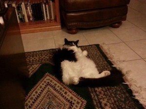 Handsome came to the shelter as one in a litter of four very feral older kittens.  I remember cleaning their cage a few times–all of them huddled in a group to one corner, peering suspiciously at me as I removed their litter box and refilled their food and water bowls.  The four of them were named after members of the band, Guns ‘n’ Roses, and one, a little more wary than the others and the only long-haired cat in the bunch, was named “Slash.”  Gradually, all of the other kittens were fostered and went to good homes.  Slash, however, needed some extra love and care.  I remember getting touch with one of the other volunteers, and asking her about cats that needed foster homes.  Slash leapt immediately to mind.  Within a week, he was in our home.