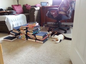 Too many books! O.O. On another note. You need to add your kitty to tummy rub Tuesday on my blog. 🙂