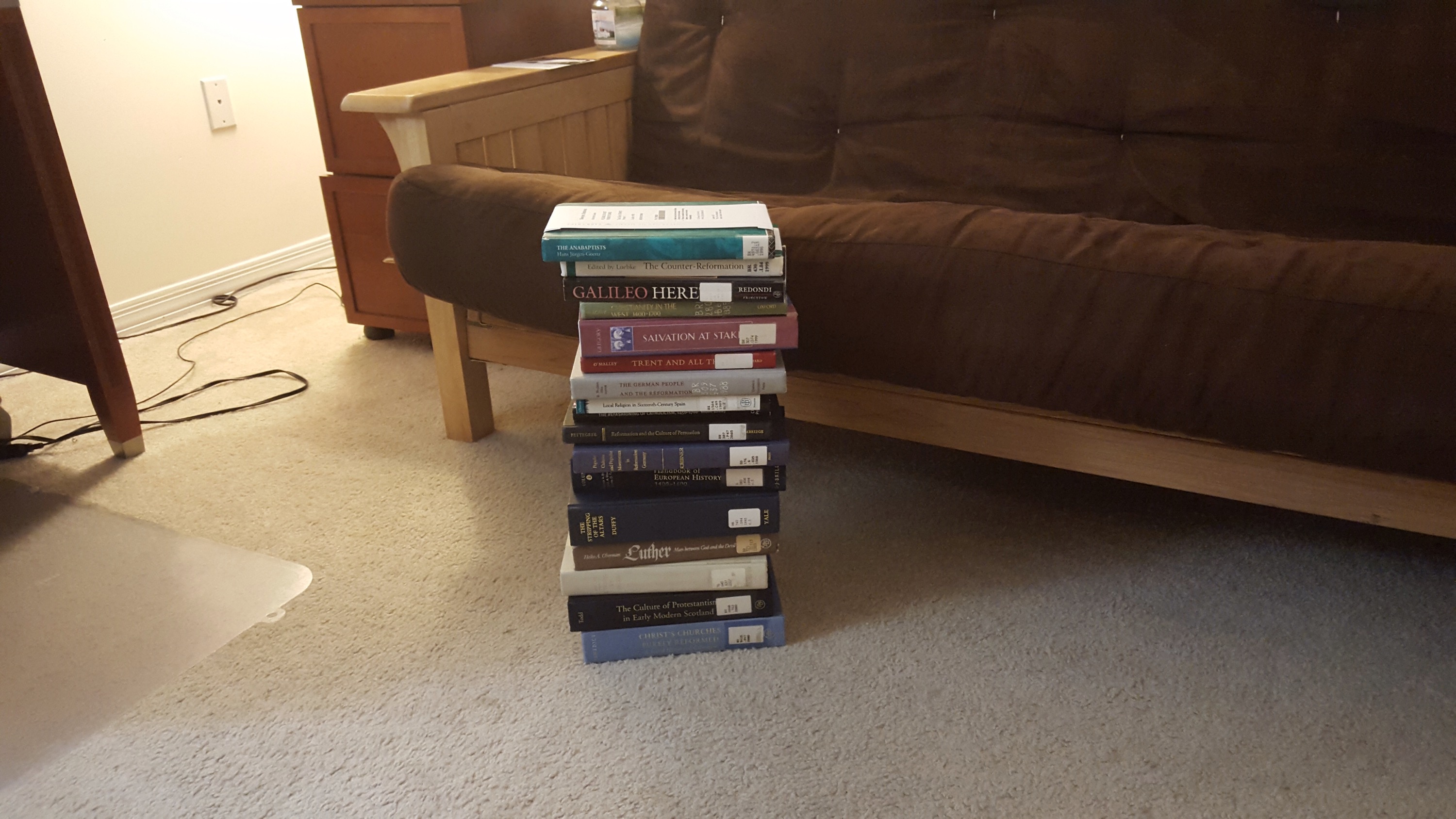 That is (most of) the Reformation reading list. There are 17 books stacked there. I want to see if I can finish going through all of them before we leave in about a week and a half. It’s an ambitious goal, but it is doable. I’d like to go away thinking I at least have one section of one bibliography covered.