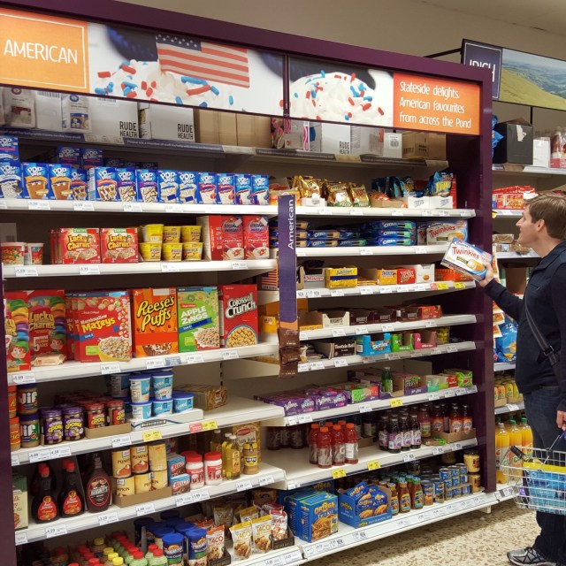 Since we usually rent a flat for the duration of our stay, we always need to pick up general household items, and one of the best places to acquire them is Tesco, a large supermarket at one end of the city. I’ve been there many times, but, this time, I came across a new “American” section. Many healthy choices on offer there, as you can see.