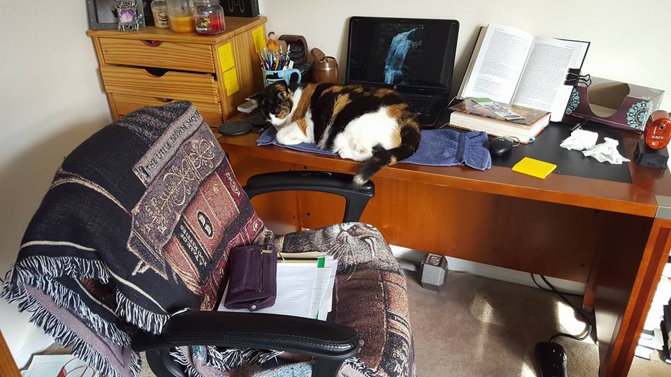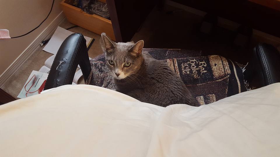 I spend most days moving between two chairs in my house–the “reading” chair and the “note taking” chair, the latter of which is my desk chair. I have found, however, that this is a particularly desirable location from the perspective of the cat population in this house.